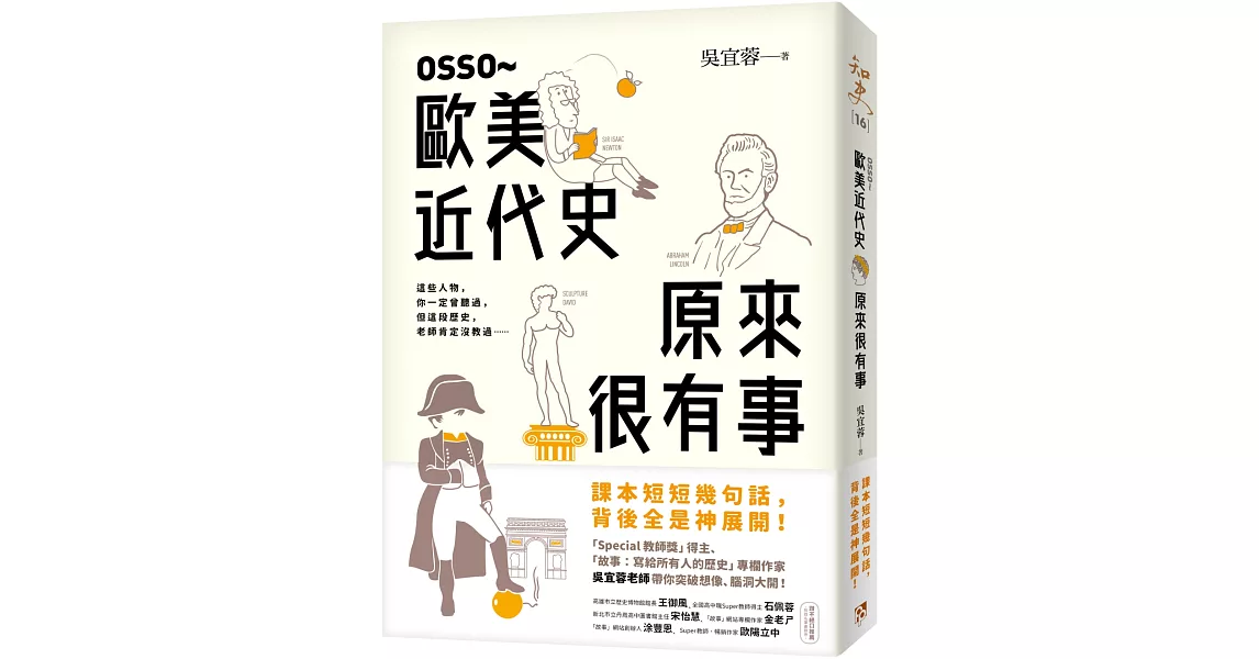以一篇〈邀古人速解108新課綱〉轟動武林、驚動部長的吳宜蓉老師,透過生動風趣的文字、深入獨到的角度,為你重新解讀歐美近代史,從穿越時空最不能遇見的老公到拿破崙vs.笛卡兒的情書對抗賽,從美國歷史最偉大的總統到史上「顏值」最高的國父,既有哏又有料,徹底把你對歐美近代史的刻板印象完全打掉重練,讓你看完之後忍不住大呼:不要旋轉我!原來歷史課本這麼有趣!