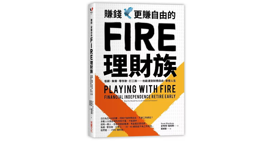 「史考特‧瑞肯斯欣然信奉『FIRE運動』,成效斐然,做出艱難的必要抉擇,激烈改變他家庭的財務未來。想要展開類似生活境地的人,都能曾從此書獲得啟發。如果你覺得困住了,或是無法伸展創意才情,而且過著無法自我掌控的生活,那麼,這或許正是你所需的書。」──史考特.銓屈(Scott Trench),《作主生活》(Set for Life)作者、「大錢包理財」(BiggerPockets Money)播客訪談主持人