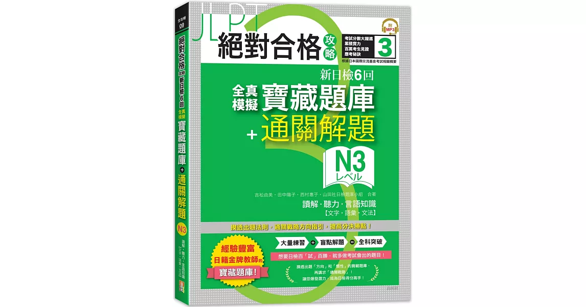 博客來-絕對合格攻略!新日檢6回全真模擬N3寶藏題庫+通關解題【讀解、聽力、言語知識〈文字、語彙、文法〉】(16K+MP3)訂購網址: https://www.books.com.tw/exep/assp.php/87926/products/0010868475?utm_source=87926&utm_medium=ap-books&utm_content=recommend&utm_campaign=ap-201906