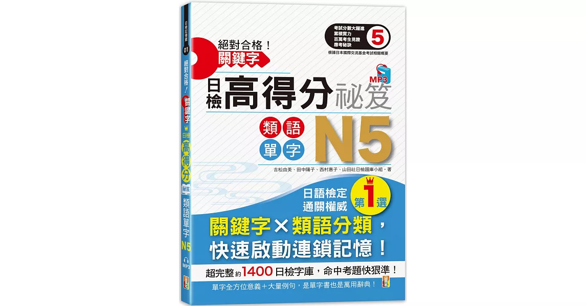 博客來-絕對合格!關鍵字日檢高得分秘笈 類語單字N5 (25K+MP3)訂購網址: https://www.books.com.tw/exep/assp.php/87926/products/0010876347?utm_source=87926&utm_medium=ap-books&utm_content=recommend&utm_campaign=ap-201906
