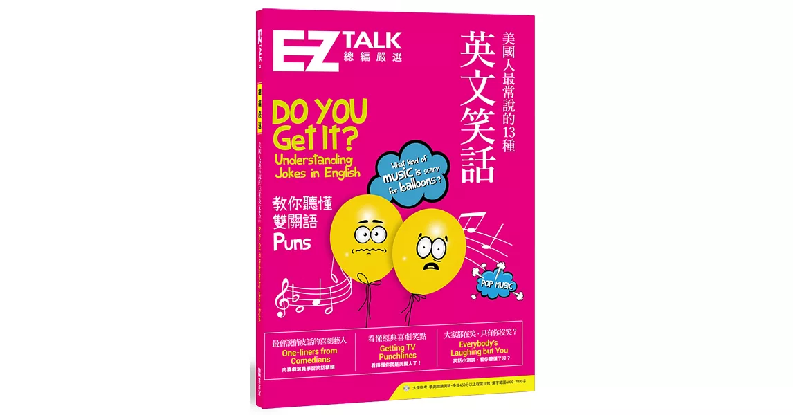 博客來-美國人最常說的13種英文笑話:EZ TALK 總編嚴選特刊(1書1MP3)訂購網址: https://www.books.com.tw/exep/assp.php/87926/products/0010805240?utm_source=87926&utm_medium=ap-books&utm_content=recommend&utm_campaign=ap-201905