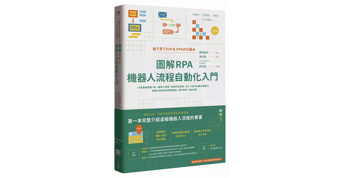 博客來-圖解RPA機器人流程自動化入門:10堂基礎課程+第一線導入實證,從資料到資訊、從人工操作到數位勞動力,智慧化新技術的原理機制、運作管理、效益法則訂購網址: https://www.books.com.tw/exep/assp.php/87926/products/0010835818?utm_source=87926&utm_medium=ap-books&utm_content=recommend&utm_campaign=ap-202002