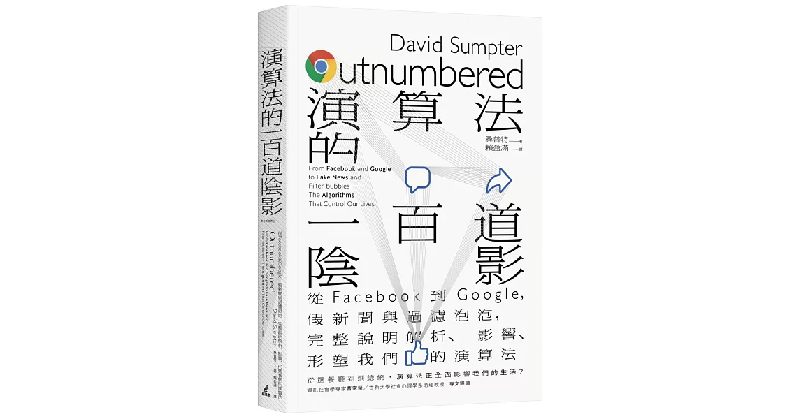 商品描述: 書名:演算法的一百道陰影:從Facebook到Google,假新聞與過濾泡泡,完整說明解析、影響、形塑我們的演算法,原文名稱:Outnumbered: From Facebook and Google to fake news and filter-bubbles – the algorithms that control our lives,語言:繁體中文,ISBN:9789862624128,頁數:304,出版社:貓頭鷹,作者:桑普特,譯者:賴盈滿,出版日期:2020/01/11,類別:社會科學