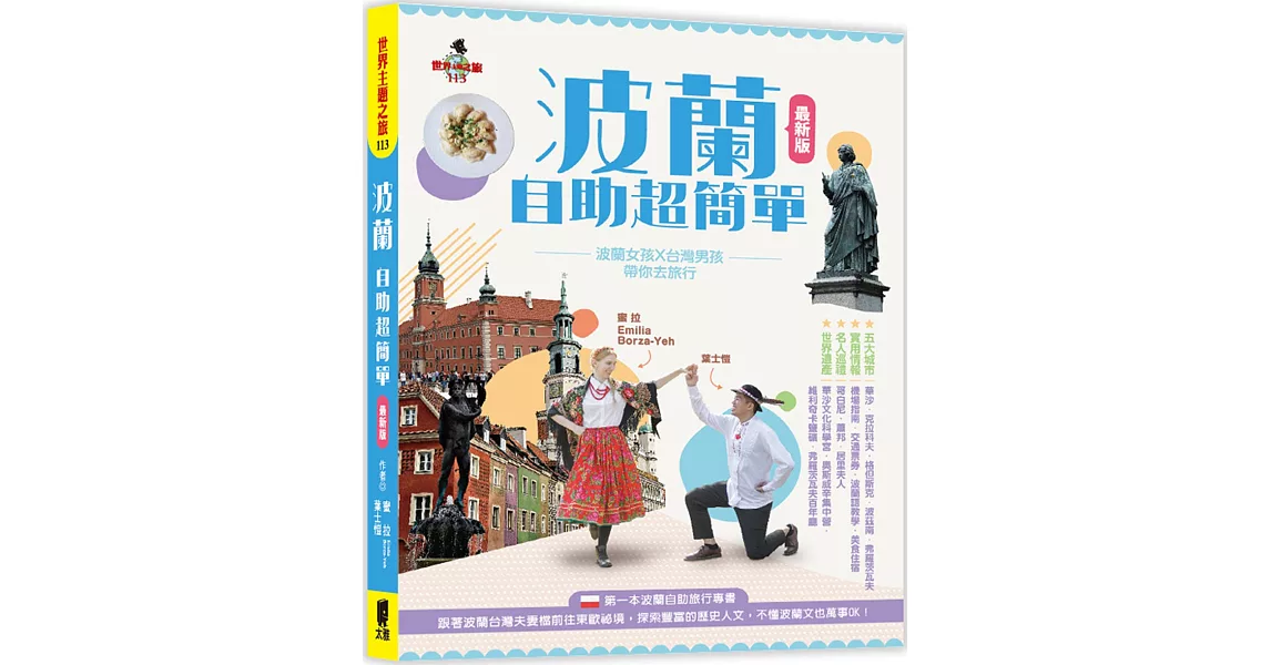 商品描述: 書名:波蘭自助超簡單:波蘭女孩X台灣男孩帶你去旅行(最新版),語言:繁體中文,ISBN:9789863363330,頁數:288,出版社:太雅出版社,作者:蜜拉(Emilia Borza-Yeh),葉士愷,出版日期:2019/08/01,類別:旅遊