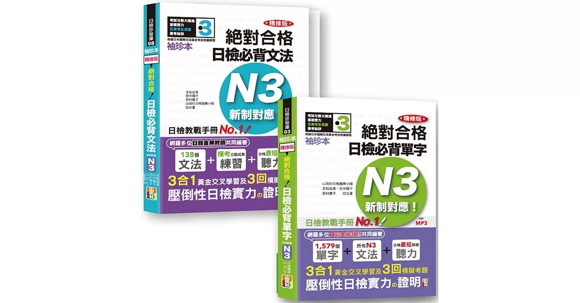 博客來-日檢N3袖珍本套書:袖珍本 精修版 新制對應 絕對合格!日檢必背 [單字,文法] N3熱銷套書(50K+MP3)訂購網址: https://www.books.com.tw/exep/assp.php/87926/products/0010838138?utm_source=87926&utm_medium=ap-books&utm_content=recommend&utm_campaign=ap-201906