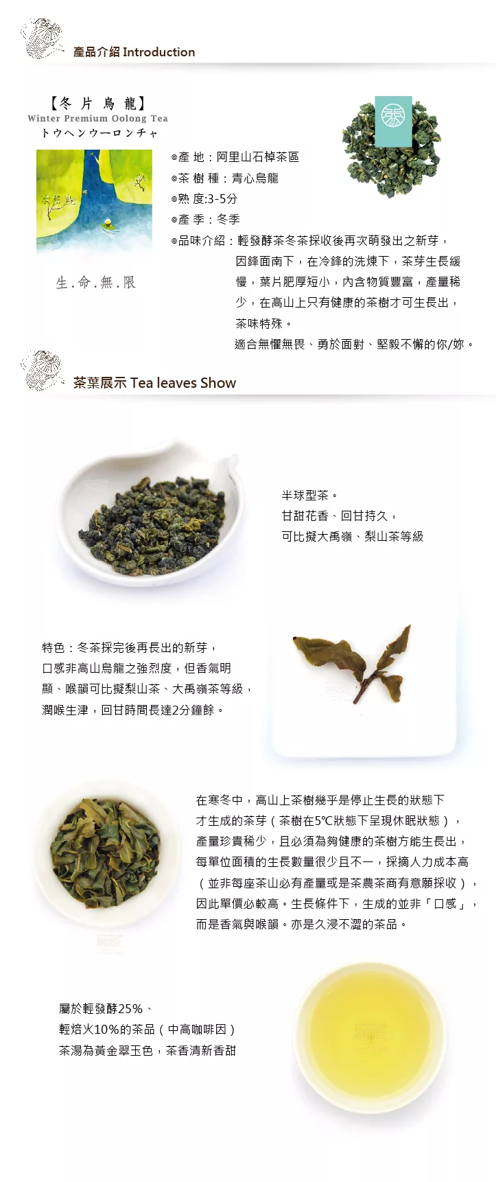 》》品味介紹:冬茶採收後再次萌發出之新芽,在冷鋒的洗煉下,茶芽生長緩慢、葉片肥厚短小,內含礦物質及微量元素極其豐富,產量珍貴稀少,在高山上只有最健康的茶樹才可生長出。上上選的特殊茶味—清香,甘甜,柔美。