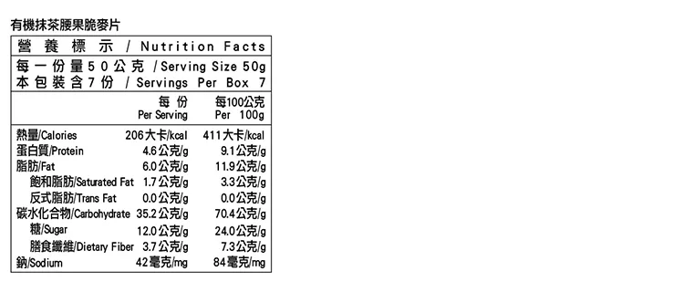 商品說明: 【米森】有機抹茶腰果脆麥片(350g/盒)