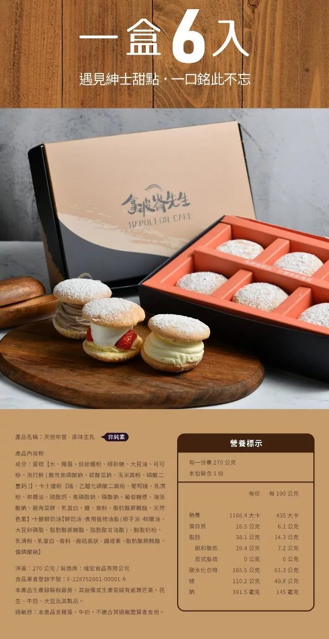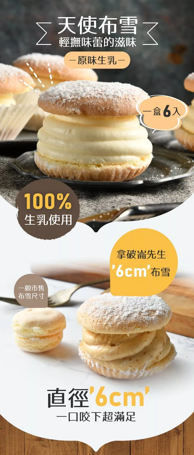 商品描述: 【拿破崙先生】天使布雪-原味生乳(6入/盒)
