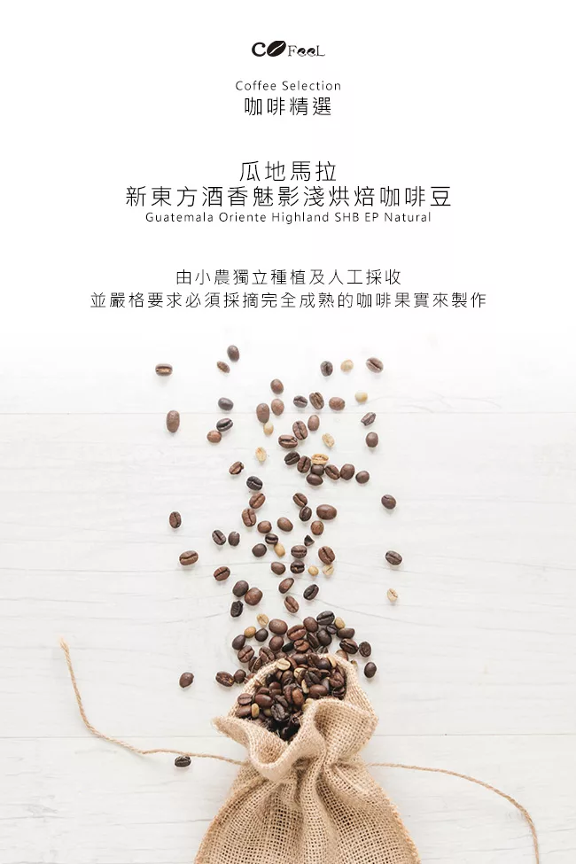 商品描述: CoFeel 凱飛鮮烘豆瓜地馬拉新東方酒香魅影淺烘焙咖啡豆玻璃精裝3瓶