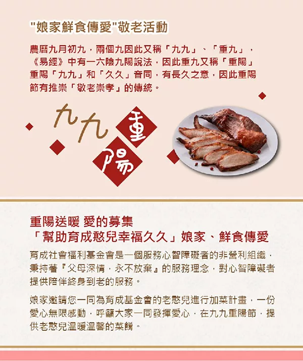 商品說明: 預購《育成基金會x娘家》鮮食傳愛-九九重陽愛心加菜計劃募集(購買者不會收到商品)