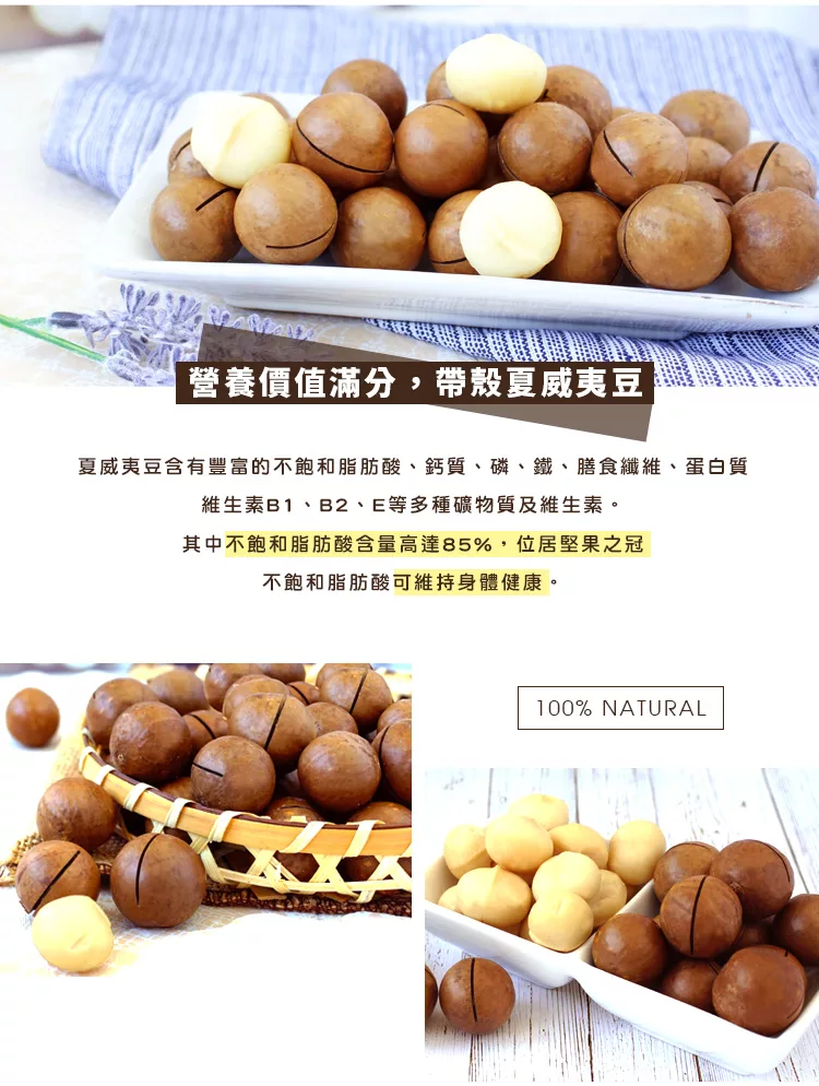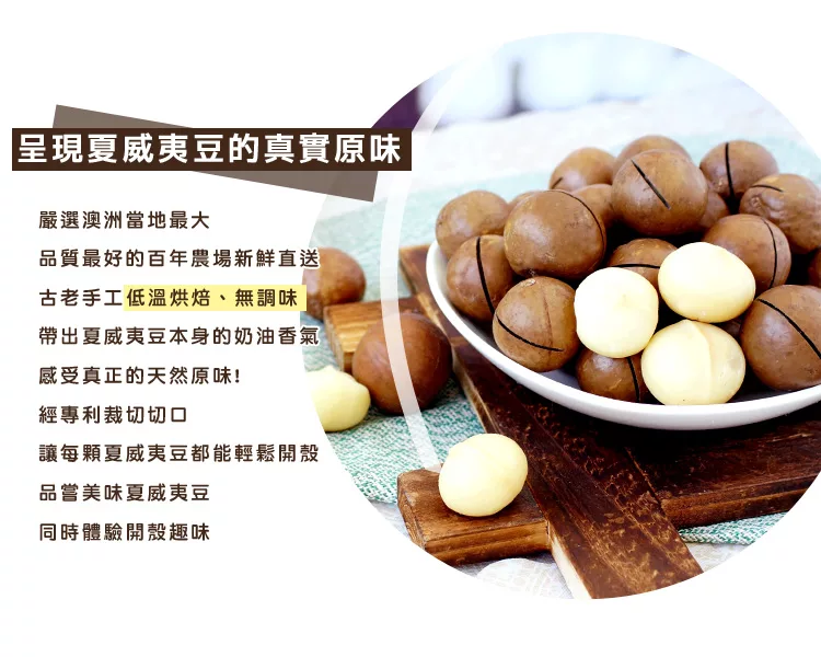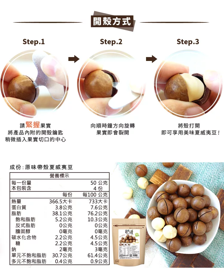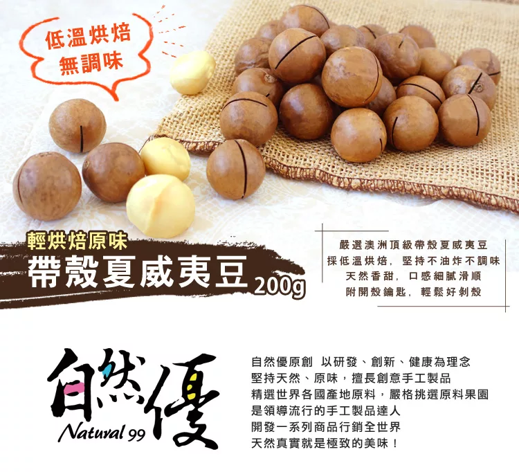 商品說明: 自然優 輕烘焙原味帶殼夏威夷豆(200g/包) 每包附開殼鑰匙一只