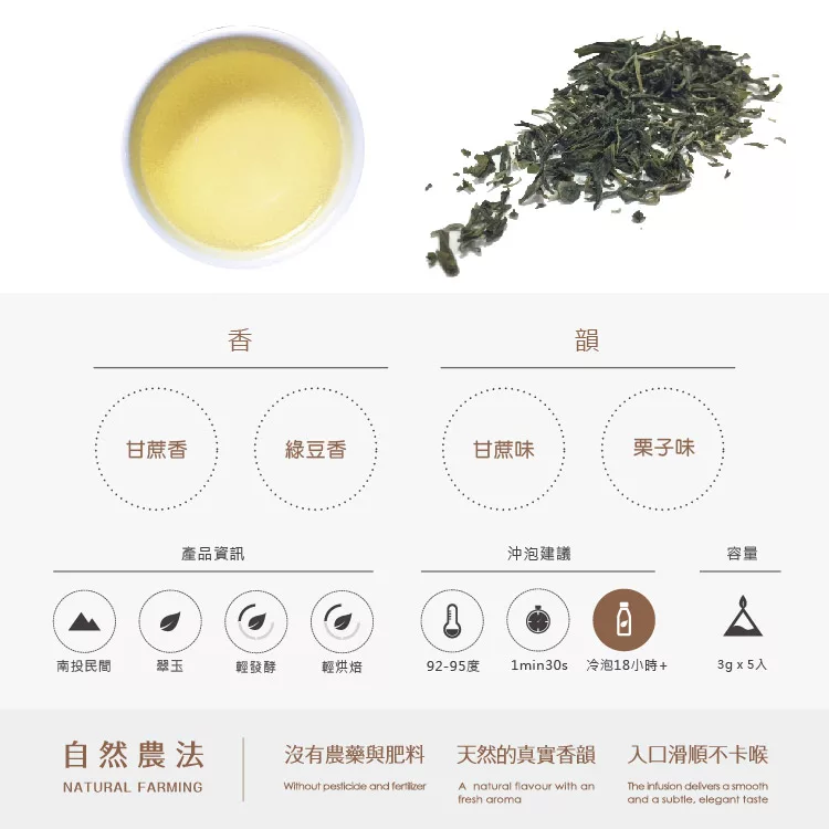 商品描述: [山山來茶]自然農法 茶包 翠玉綠茶(3g x 5入)