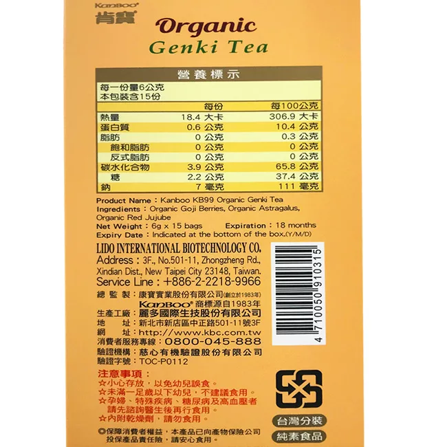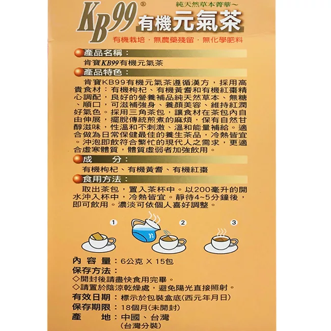 商品說明: 肯寶KB99 有機元氣茶2入組(6gx15包/盒)