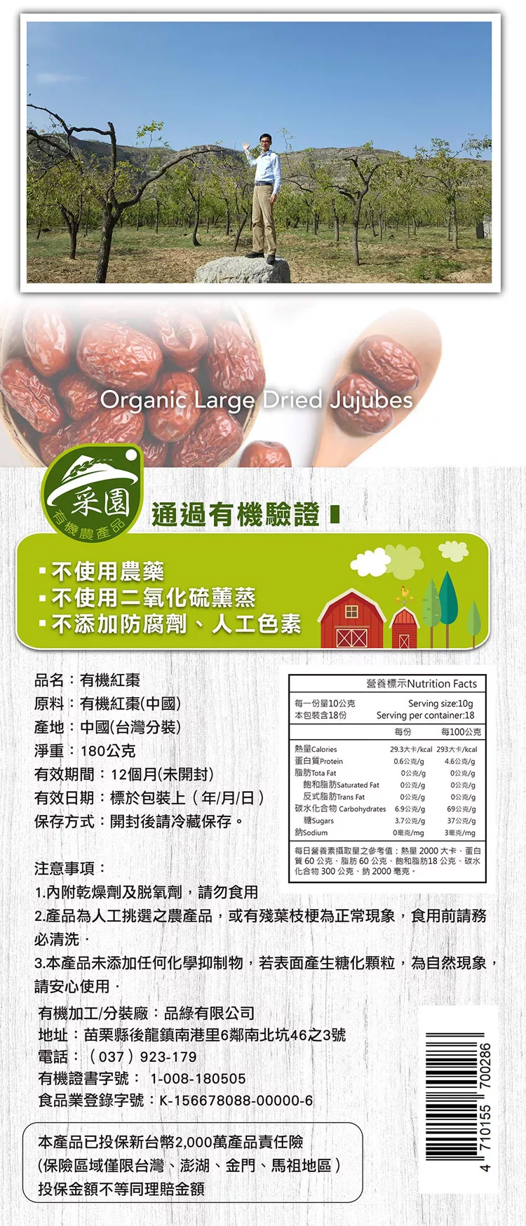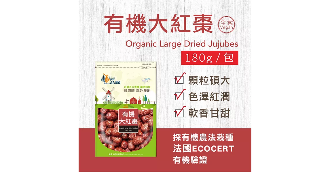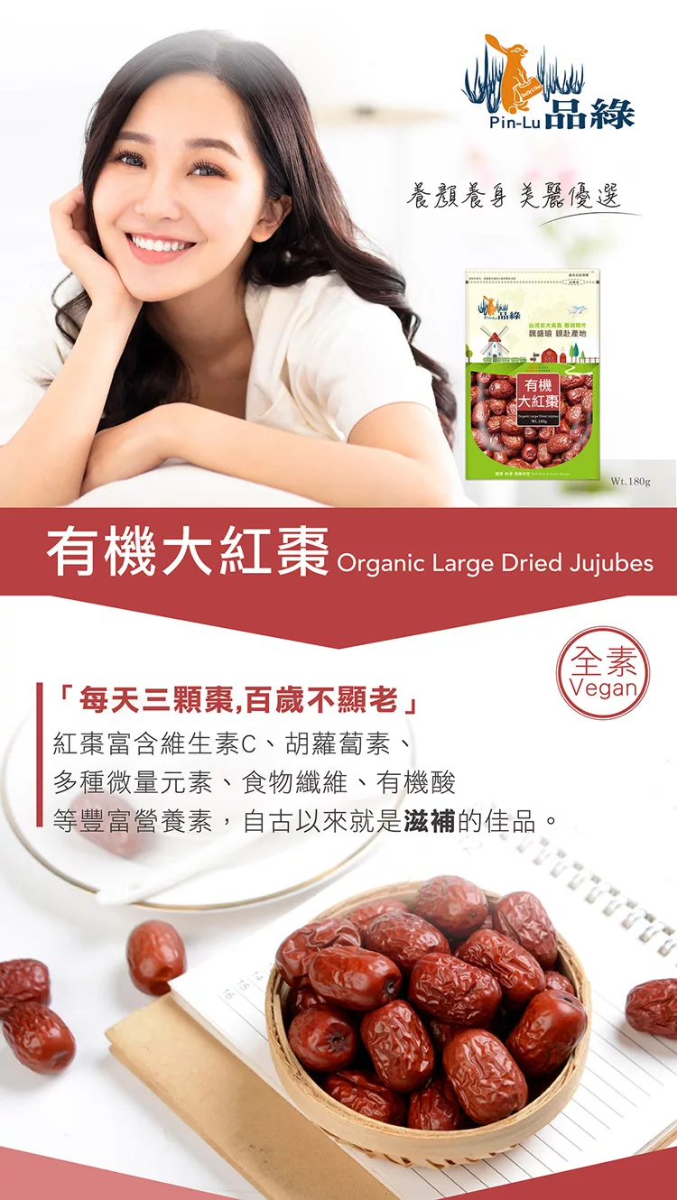 商品描述: 【品綠】有機大紅棗–180g/袋