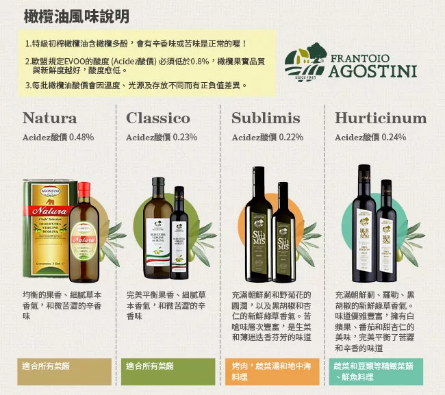 商品說明: 【曼時】Agostini莊園 義大利特級初榨橄欖油 Natura 1000ml x2 + Hurticinum 250ml 經典3件組