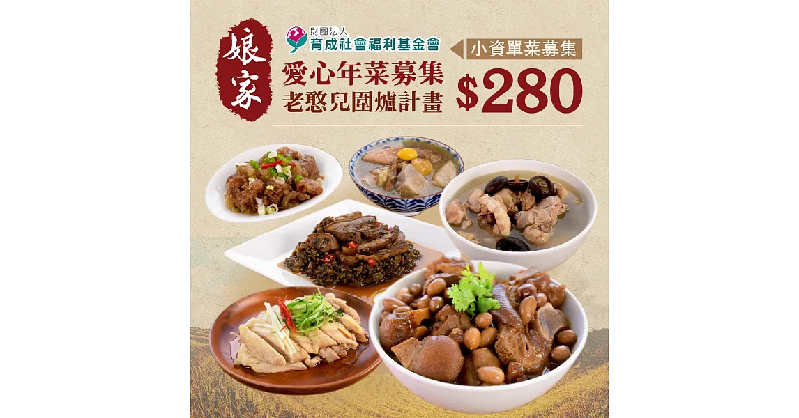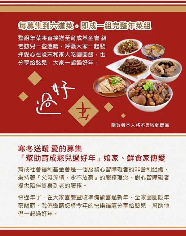 商品說明: 預購《育成基金會x娘家廚房CK》老憨兒圍爐計畫-愛心年菜募集(購買者不會收到商品)
