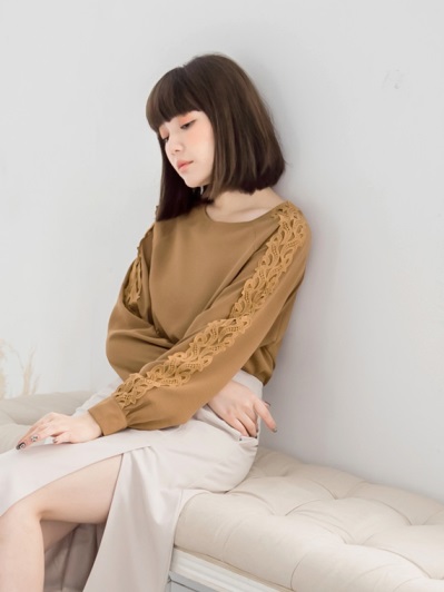 蕾絲布滾袖質感雪紡上衣
