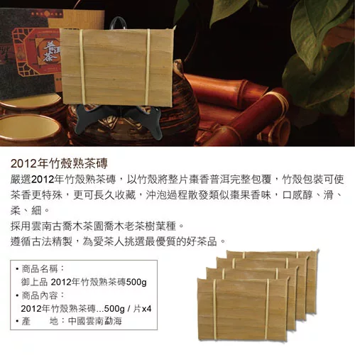 商品說明: 《御上品》 2012年竹殼熟茶磚500克 超值4入組